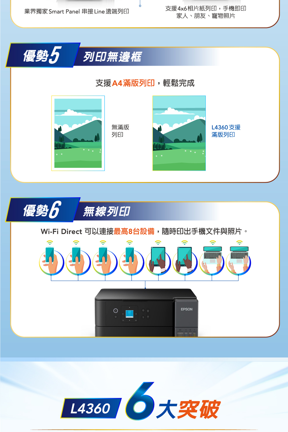搭載 4800*1200dpi 高解析度列印技術,可進行無邊界相片輸出,並支援多種行動列印技術(如 AirPrint、Epson iPrint、Remote Print 等)。Wi-Fi 與 Wi-Fi Direct 雙模式連線(支援最多 8 台裝置同時無線列印),是居家學習、SOHO 辦公與補習班的高效利器。