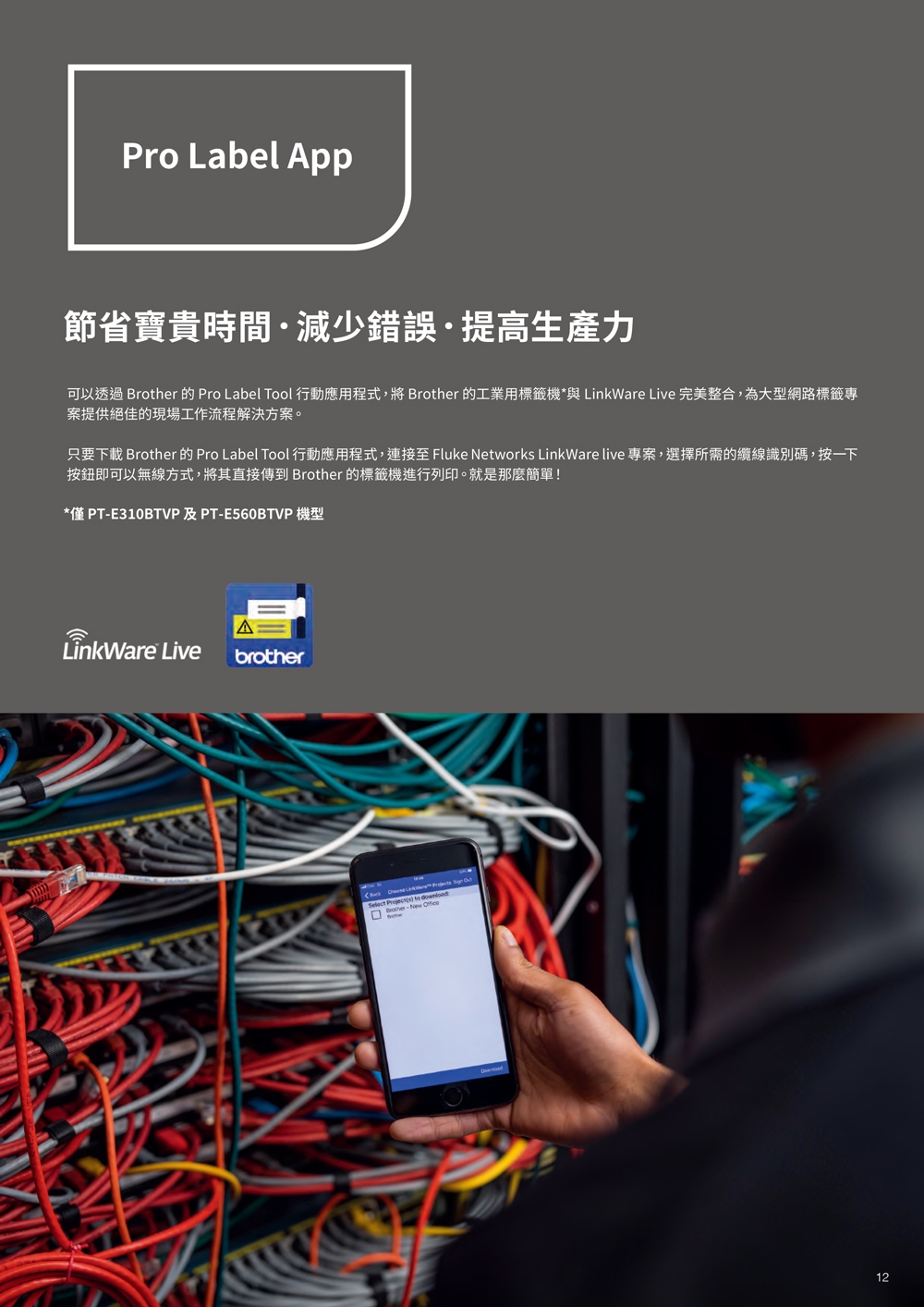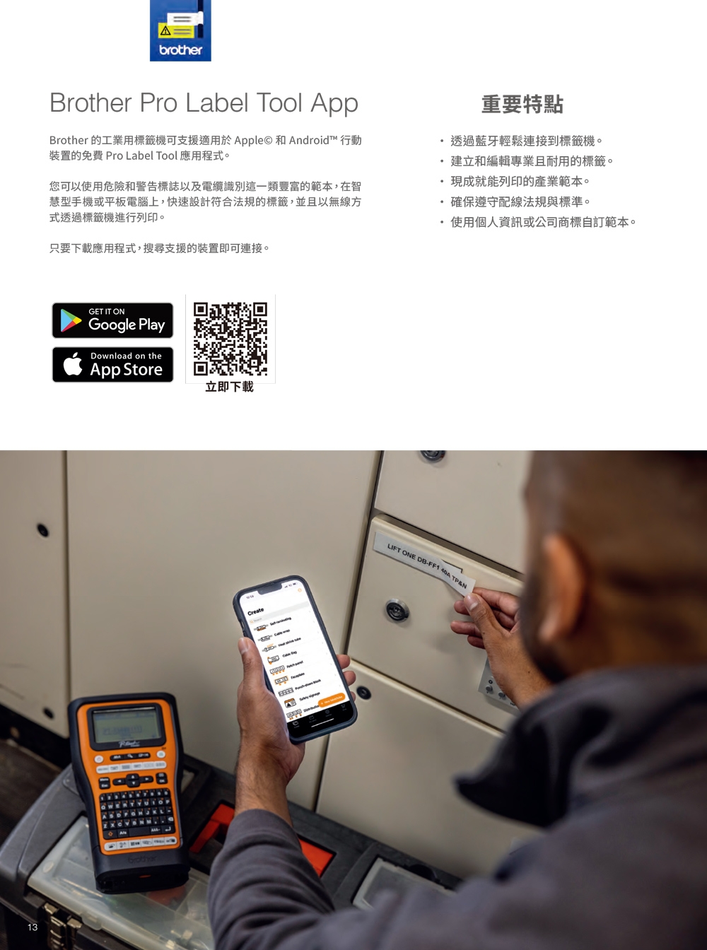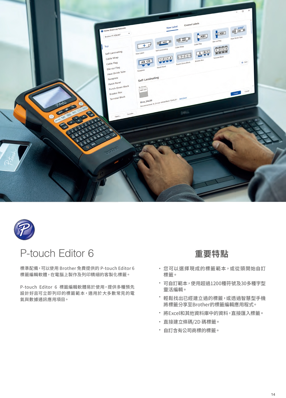 USB 2.0、Wi‑Fi 與「Brother Mobile Cable Label Tool」App 連接,電腦、手機或平板皆可快速編輯與傳輸標籤內容。 -